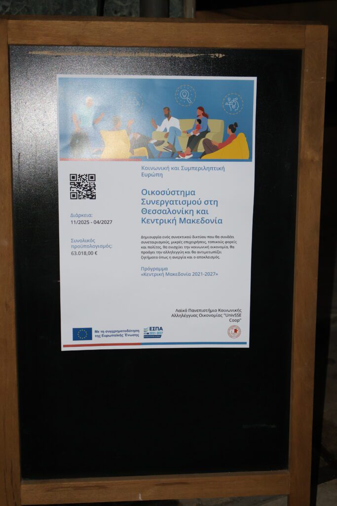 Στις 16.12.2025 πραγματοποιήθηκε η εκδήλωση έναρξης του προγράμματος «Οικοσύστημα Συνεργατισμού στη Θεσσαλονίκη και Κεντρική Μακεδονία», στα γραφεία του Λαϊκού Πανεπιστημίου Κοινωνικής Αλληλέγγυας Οικονομίας «UnivSSE Coop».