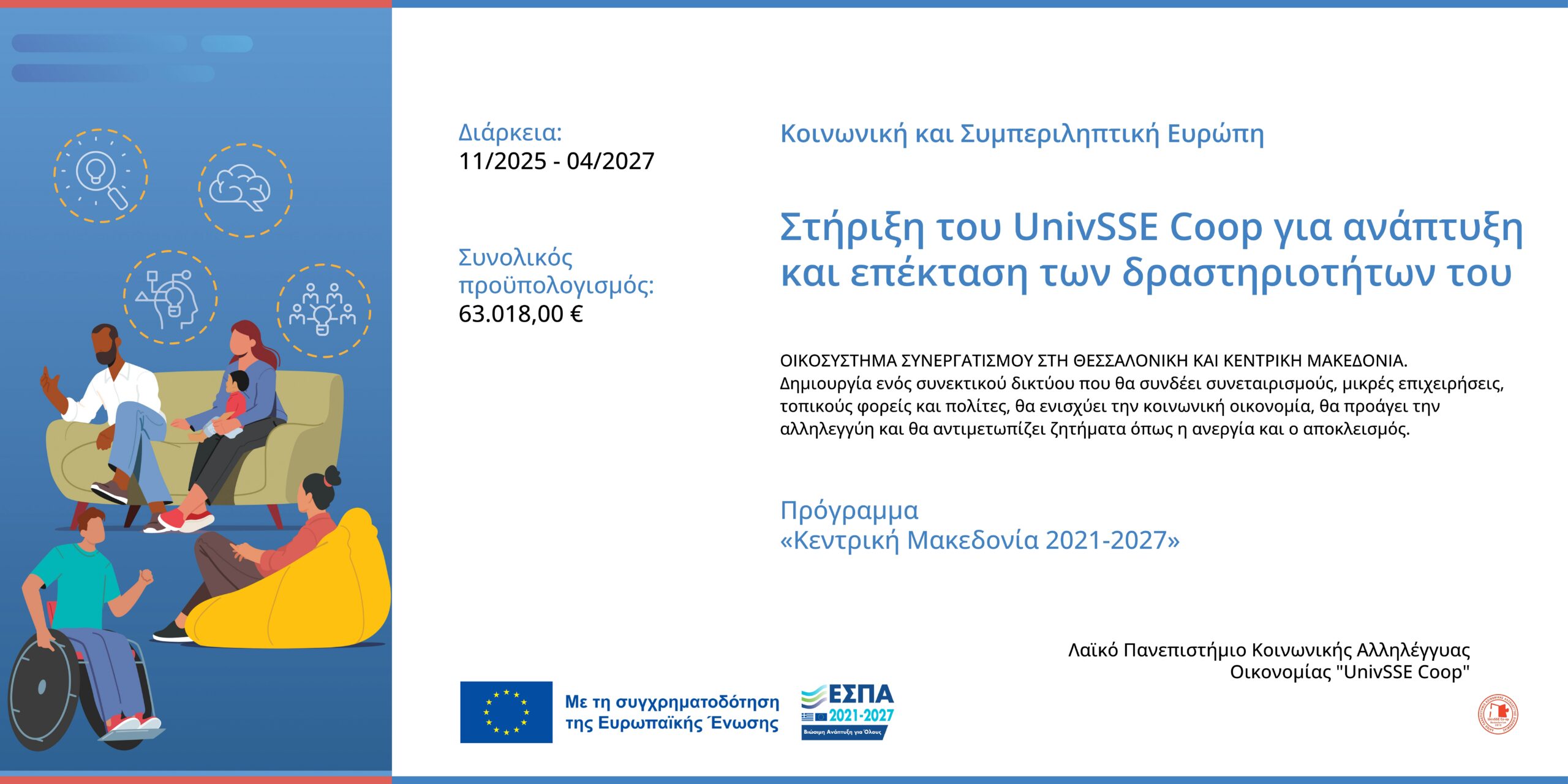 Ο κοινωνικός μη-κερδοσκοπικός συνεταιρισμός Λαϊκό Πανεπιστήμιο Κοινωνικής Αλληλέγγυας Οικονομίας “UnivSSE Coop” υλοποιεί το πρόγραμμα “Οικοσύστημα Συνεργατισμού στη Θεσσαλονίκη και Κεντρική Μακεδονία”, το οποίο αφορά στη δημιουργία ενός συνεκτικού δικτύου που θα συνδέει συνεταιρισμούς, μικρές επιχειρήσεις, τοπικούς φορείς και πολίτες, θα ενισχύει την κοινωνική οικονομία, θα προάγει την αλληλεγγύη και θα αντιμετωπίζει ζητήματα όπως η φτώχεια, η ανεργία και ο κοινωνικός αποκλεισμός.