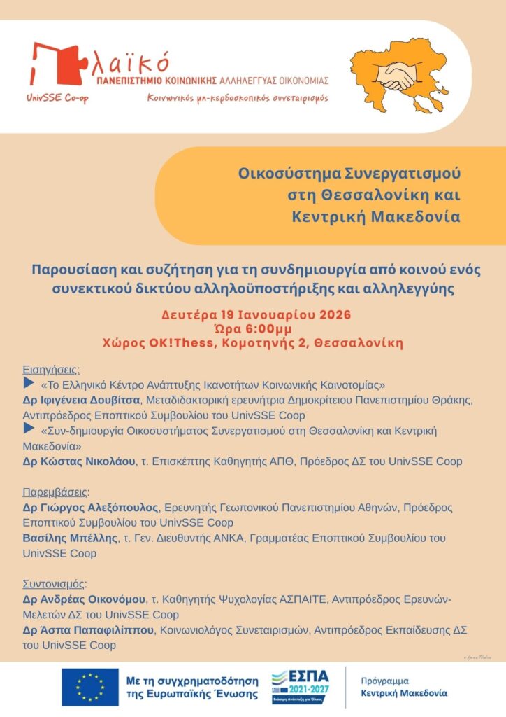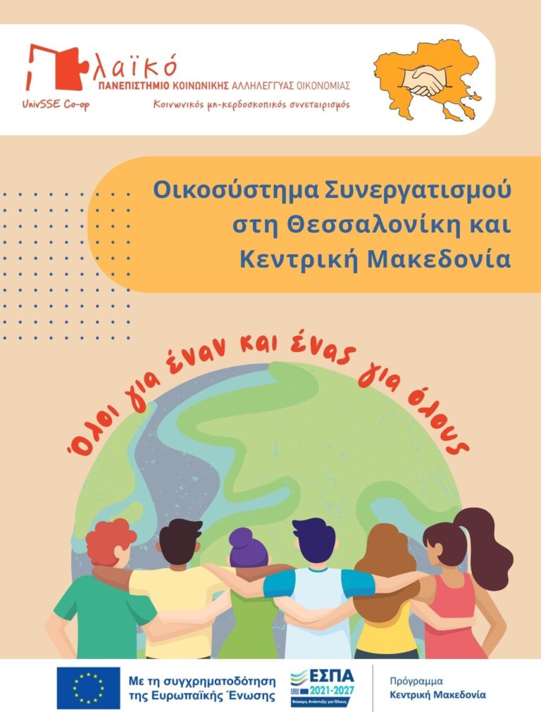 Πρόκειται για τη συνδημιουργία ενός «Οικοσυστήματος Συνεργατισμού στη Θεσσαλονίκη και Κεντρική Μακεδονία», που υλοποιείται με την υποστήριξη του Λαϊκού Πανεπιστημίου Κοινωνικής Αλληλέγγυας Οικονομίας «UnivSSE Coop» και τη συγχρηματοδότηση της Ευρωπαϊκής Ένωσης – ΕΣΠΑ – Πρόγραμμα «Κεντρική Μακεδονία 2021-2027».